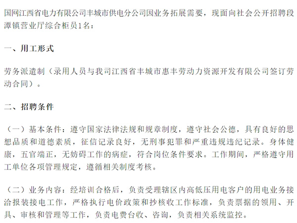 ->查看國網(wǎng)江西省電力有限公司豐城市供電分公司因業(yè)務(wù)拓展需要,現(xiàn)面向社會公開招聘段潭鎮(zhèn)營業(yè)廳綜合柜員1名:一、用工形式勞務(wù)派遣制(錄用人員與我司江西省豐城市惠豐勞動(dòng)力資源開發(fā)有限公司簽訂勞動(dòng)合同)。二、招聘條件(一)基本條件:遵守國家法律法規(guī)和規(guī)章制度,遵守社會公德,...